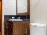 - The master bedroom houses a king-sized bed with a large dresser with a cutout for a TV, twin side tables, and lampshades