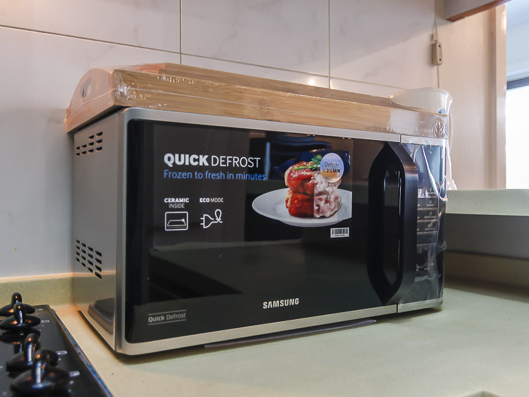 - Open area kitchen in living room, with new microwave and electric stove